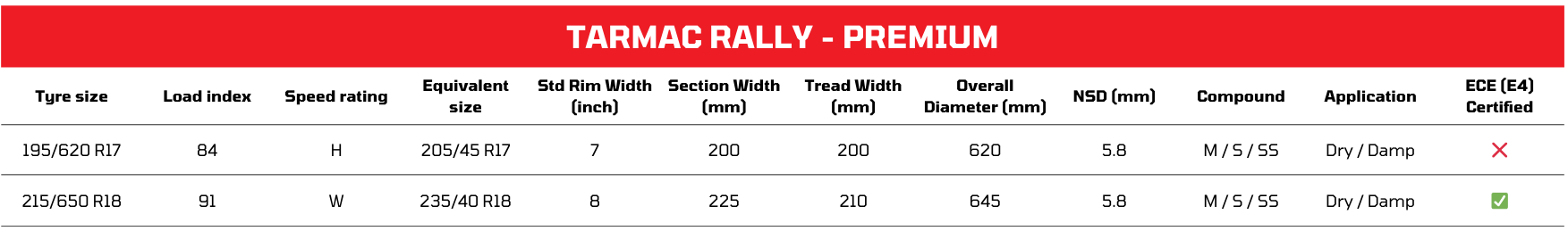 Entwickelt für Asphalt-Rallyes. Erfüllt die neuesten FIA-Vorschriften. Das speziell entwickelte asymmetrische Profil, die überlegene Konstruktion und die Mischungen sorgen für besseres Handling und Traktion unter allen Bedingungen.
